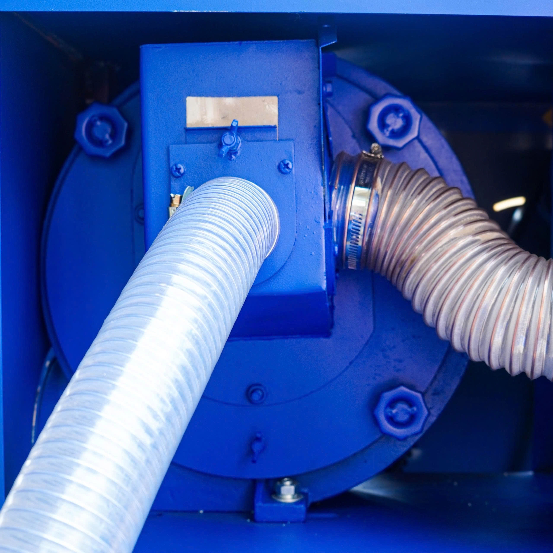 Máy được trang bị hệ thống quạt hút cùng hệ thống ống hút giúp đưa nguyên liệu dạng hạt vào buồng nghiền mà không cần phải dùng sức đổ vào toa nạp liệu như những máy khác.