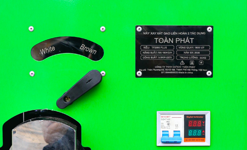 - Hộp số điều chỉnh độ tráng gạo làm bằng vật liệu thép dày, chắc chắn. Aptomat và đồng hồ hiển thị mức điện áp trực quan.
