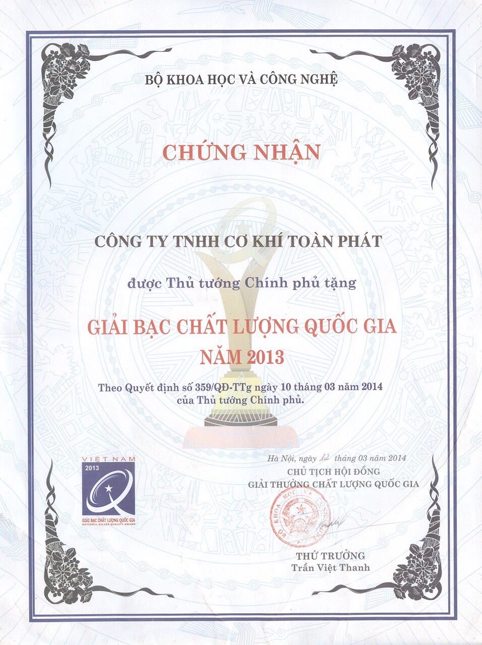 Chứng nhận GIẢI BẠC CHẤT LƯỢNG QUỐC GIA 2013