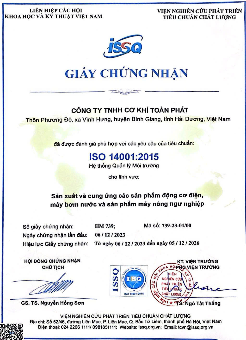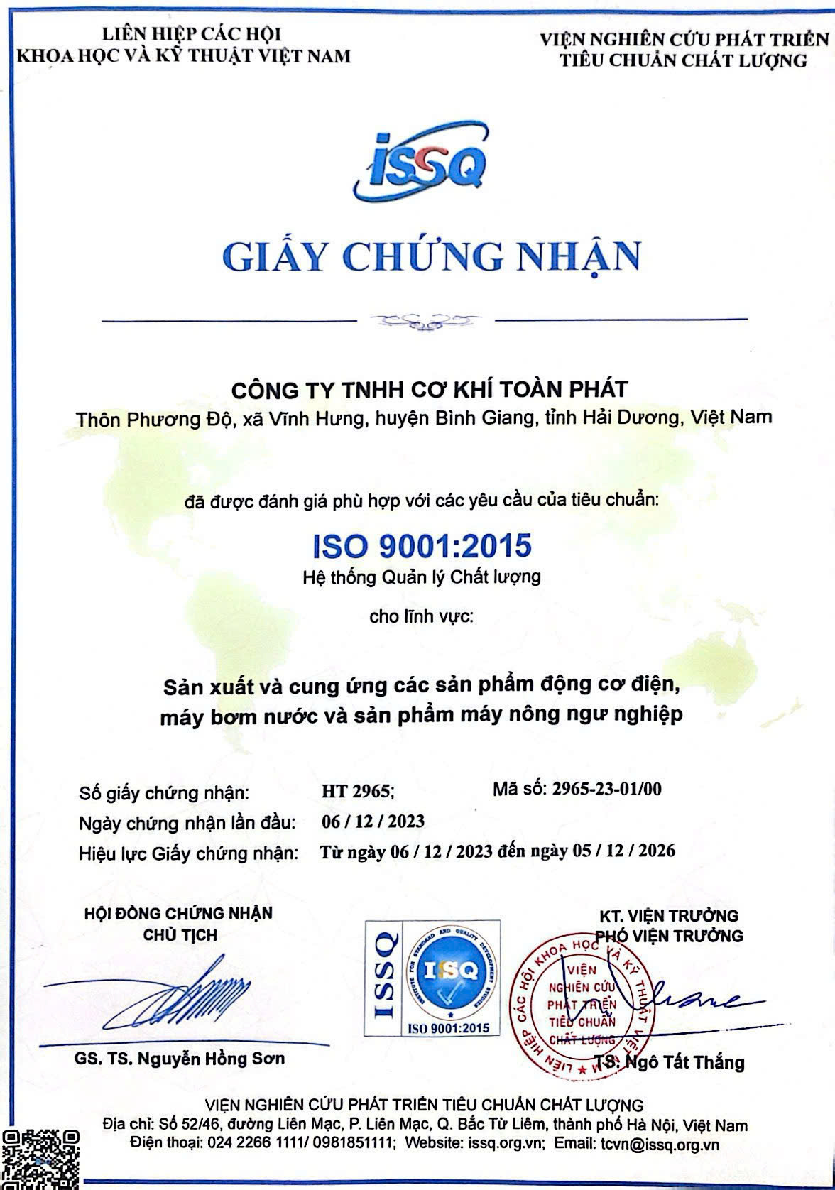 Công ty TNHH Cơ khí Toàn Phát được khởi lập từ những năm 2002. Đến nay Công ty tự hào là một doanh nghiệp luôn đi đầu và có uy tín trên thị trường trong lĩnh vực sản xuất động cơ điện một pha, ba pha có công suất từ 0,18 Kw – 315 Kw, máy bơm nước, máy đầm và các loại máy Nông ngư cơ. Toàn Phát được cấp chứng nhận phù hợp tiêu chuẩn TCVN 6627- 1:2014 (IEC60034- 1:2010) và hệ thống quản lý chất lượng theo tiêu chuẩn chuẩn ISO 9001:2015; ISO 14001:2015. Công ty đã được Cục đăng kiểm Việt Nam chứng nhận đáp ứng “Quy chuẩn kỹ thuật Quốc gia về đánh giá năng lực cơ sở chế tạo và cung cấp dịch vụ tàu biển”.